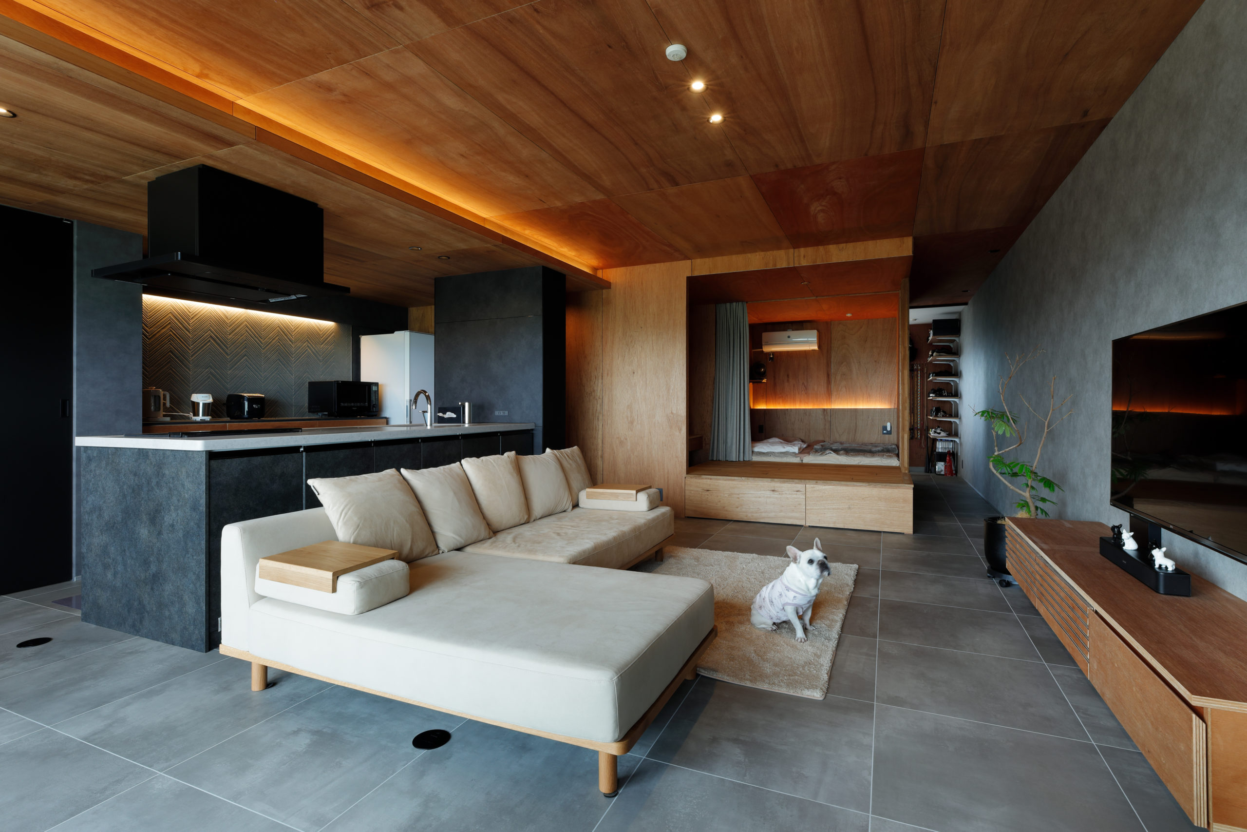 床はタイル調でスタイリッシュに仕上げ、寝室は木に囲まれた落ち着いた空間に。